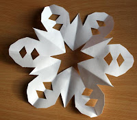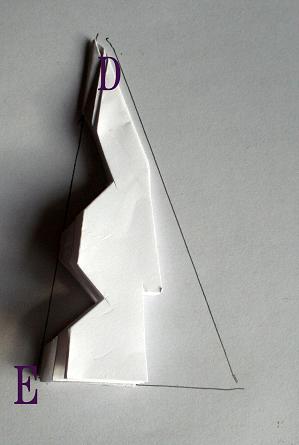 Before unfolding, you need to make additional cuts. Remember point E forms the 6 points of the snowflake and point D forms the center of the snowflake. If you cut off D, a hole will be in the center. If you cut off E, the tips will have more points.