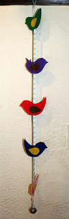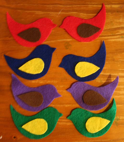 Then leaving a couple of inches, place the ribbon between two of the felt birds and sew straight down.