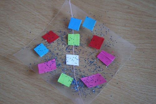 Stick your chosen decorations onto the film leaving spaces in bewtween them, and sprinkle some glitter in between.
