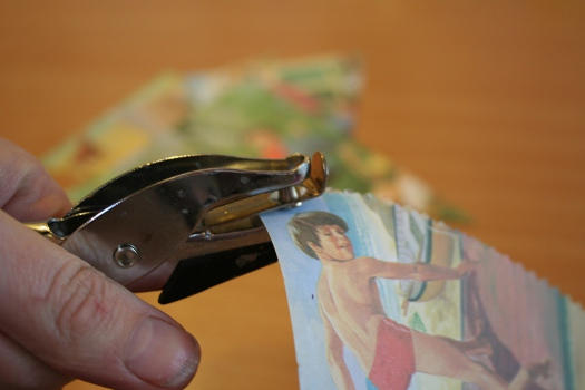 Punch a hole in both top corners of every picture {I punched all eight at once to make sure they were lined up correctly}