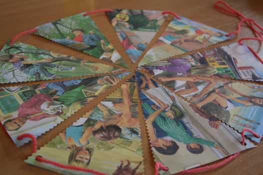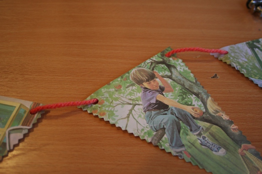 Carefully string each picture onto the yarn/ribbon that you are using. Leave four/five inches at each end for hanging, and an inch or two inbetween each triangle.