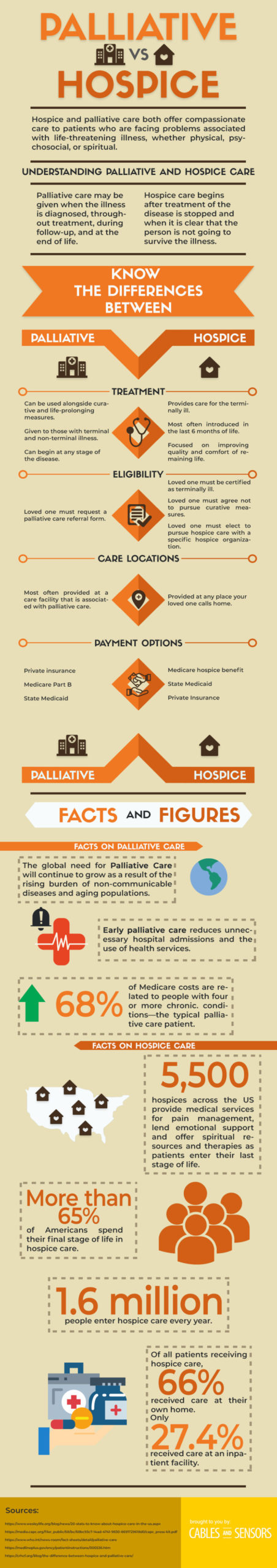 Cables and Sensors has created a comprehensive yet easy-to-read infographic about the differences between palliative care and hospice care. From the treatment, to eligibility, to care locations, to payment options, learn everything you need to know about these important facets of medical care in the infographic below.